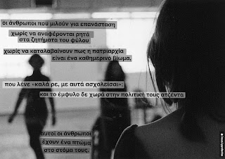 Προφανώς και οι φεμινίστριες όπως και οι κομμουνισταράδες όπως και όλοι οι άλλοι πρέπει να πάμε για ψυχοθεραπεία όλοι πριν κάνουμε πολιτική (όπως λέγαμε), δεν είναι πεφωτισμένοι οι μεν ή οι δε για να μιλούν χωρίς κλισέ και άλλα παραπετάσματα καπνού για να αποφύγουν να καταλάβουν τον εαυτό τους και τους άλλους. Αλλά όσο γίνεται αυτό, η αδικία δέρνει κάποιες ομάδες, όχι όλες εξίσου.